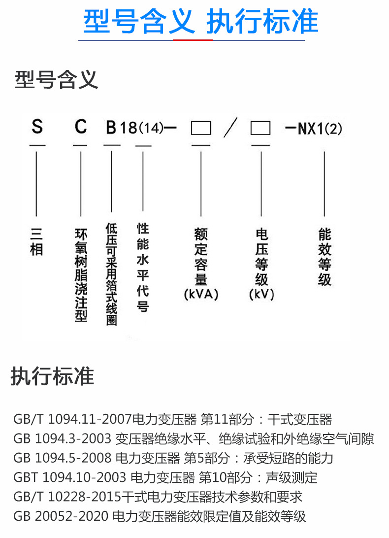 SCB表示三相樹(shù)脂澆注干式變壓器,14表示變壓器性能序列水平,1250指變壓器的額定容量,10kV是變壓器的額定電壓,NX2標(biāo)注為二級(jí)能效變壓器,是滿(mǎn)足二級(jí)能效的1250KVA干式變壓器。